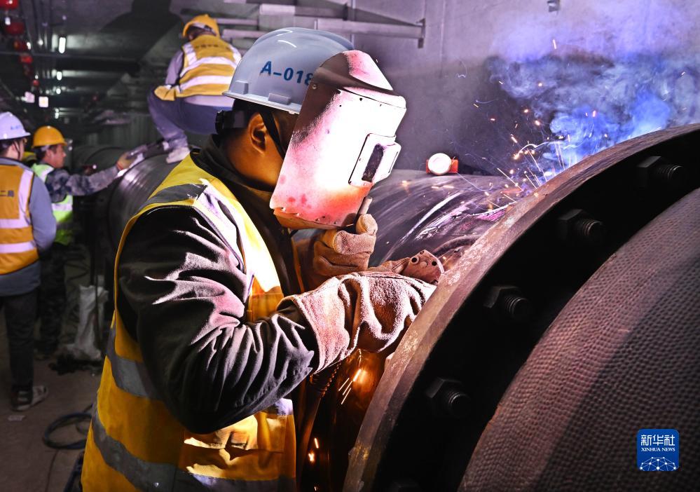 中鐵二局建設者在青島市唐河路——安順路打通工程(涉鐵段)綜合管廊內施工(11月20日攝)。