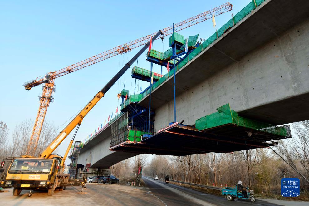 11月21日,在濟濱高鐵商惠濱2號特大橋,山東路橋集團的工作人員在進(jìn)行橋梁施工作業(yè)。