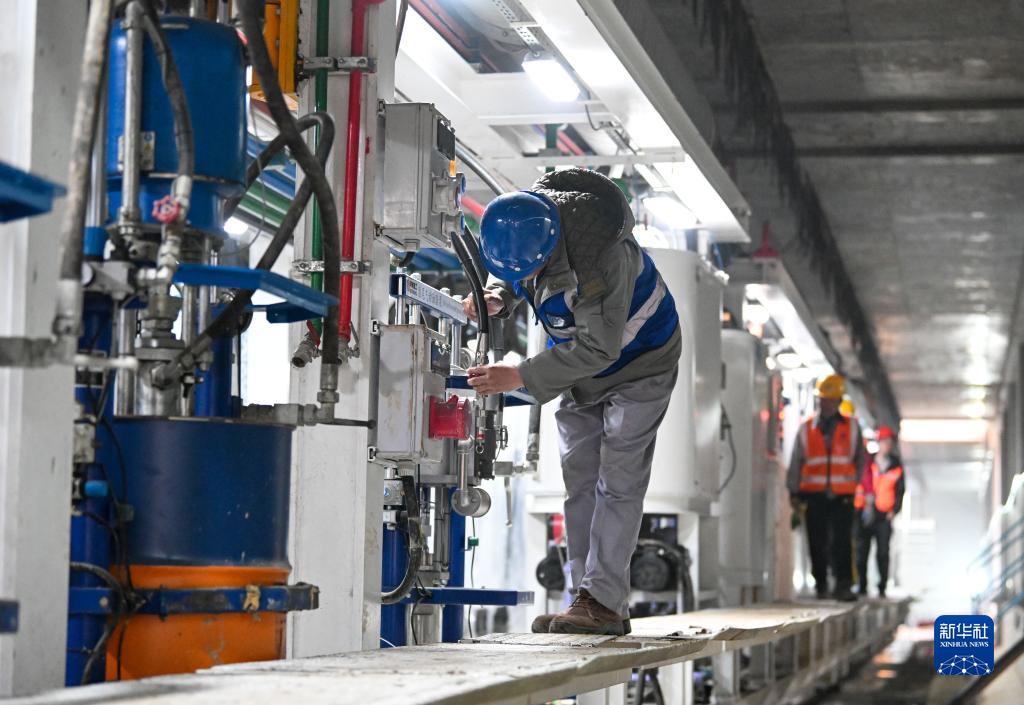 11月21日,來(lái)自中建八局的工程施工人員在作業(yè)場(chǎng)所對盾構機運行進(jìn)行維護監測。