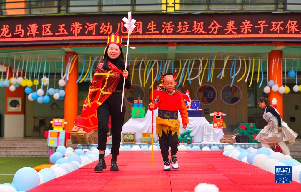 當日,四川省瀘州市龍馬潭區玉帶河幼兒園舉辦了一場(chǎng)垃圾分類(lèi)親子時(shí)裝秀,小朋友和家長(cháng)身著(zhù)用廢紙殼、塑料袋、舊報紙等材料制作的各類(lèi)創(chuàng )意服裝走上舞臺進(jìn)行展示,讓低碳生活、變廢為寶的理念深入幼兒心靈。