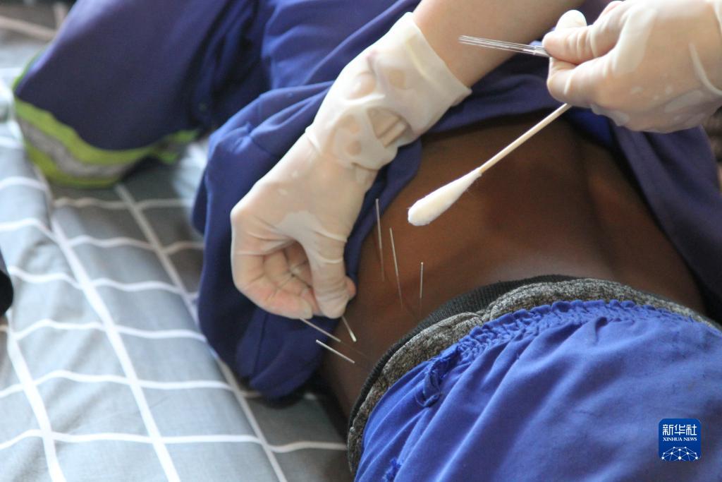 11月21日,在津巴布韋南部邊境地區的新太資源棕櫚河冶金產(chǎn)業(yè)園,中國醫療隊隊員為中企當地員工做針灸。