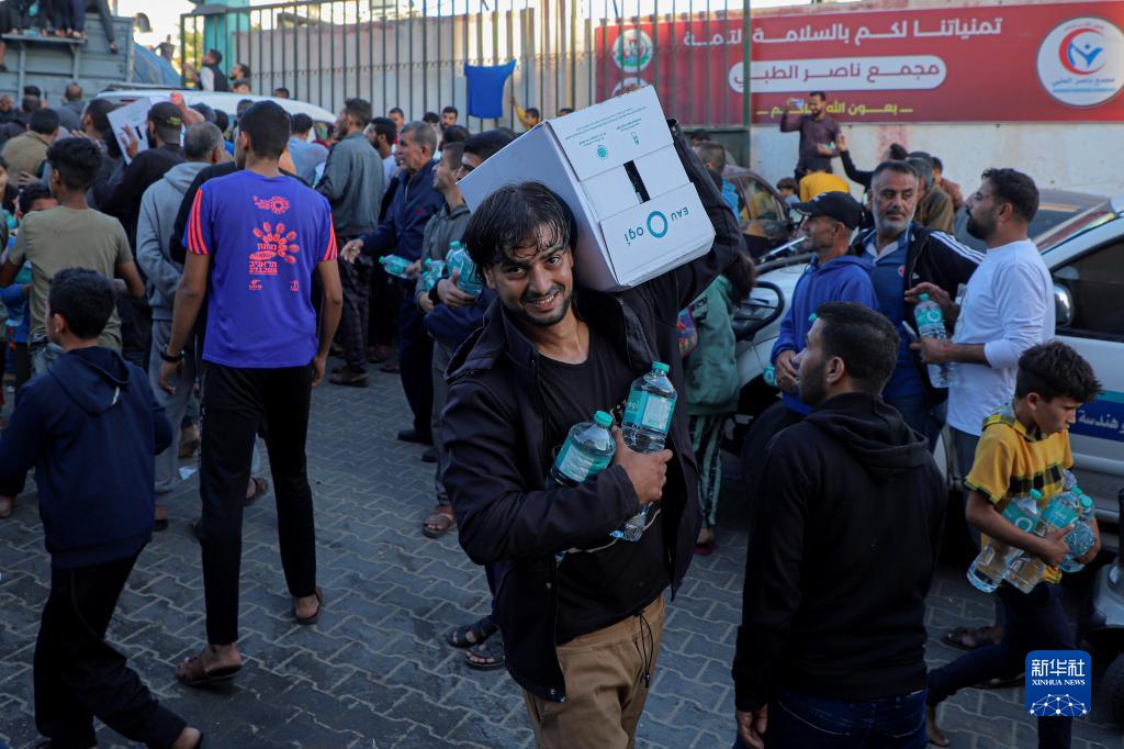 11月21日,在加沙地帶南部城市汗尤尼斯,民眾領(lǐng)取飲用水。