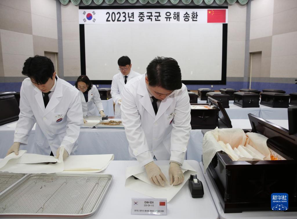 11月22日,在韓國仁川,韓方工作人員將志愿軍烈士遺骸入殮。