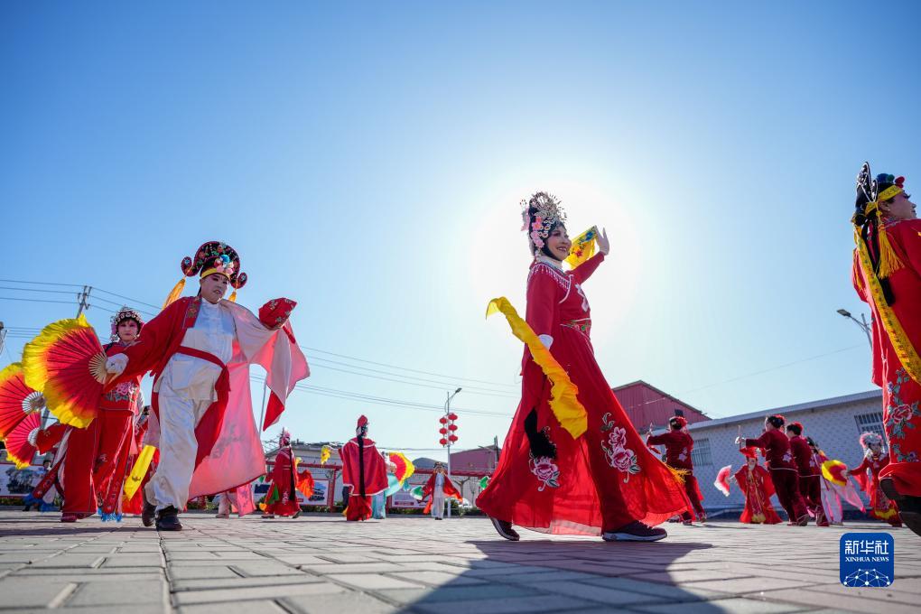 河北省灤州市葛莊村地秧歌隊隊員在村廣場(chǎng)上表演(11月17日攝)。