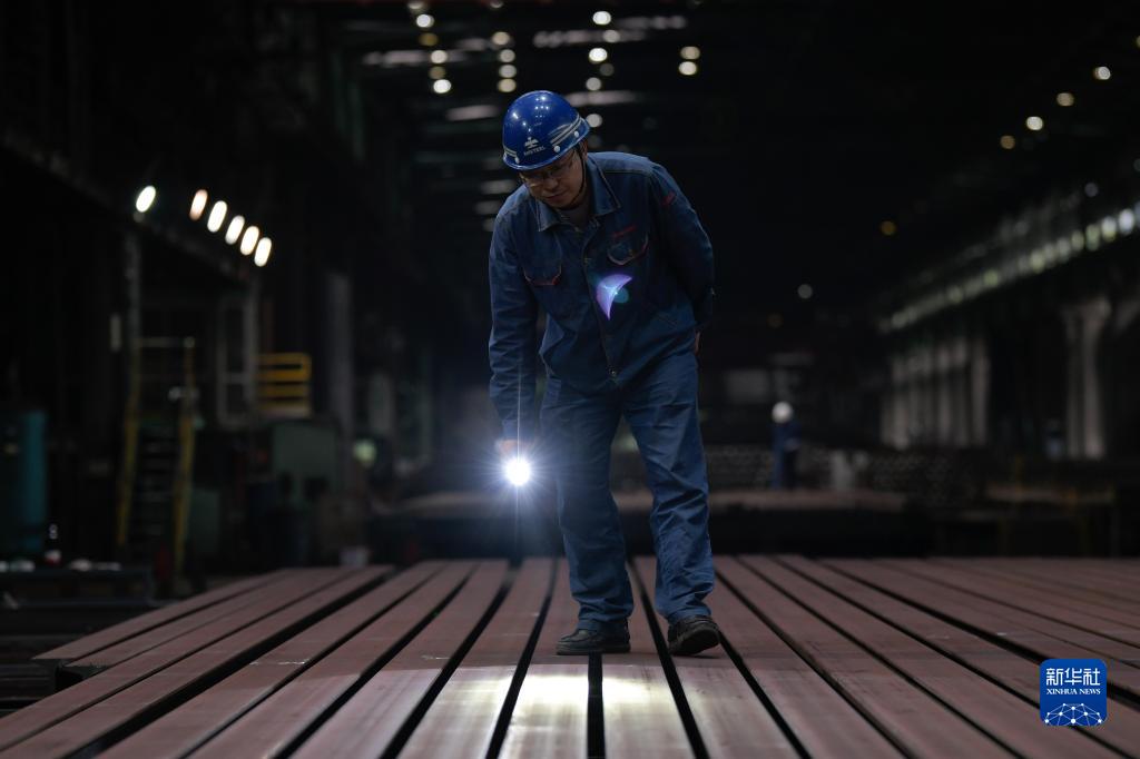 11月21日,在攀鋼釩軌梁廠(chǎng),呂攀峰在檢查鋼軌成品底部表面質(zhì)量。