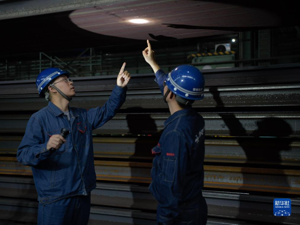 11月21日,在攀鋼釩軌梁廠(chǎng),呂攀峰(右)與同事檢查鋼軌成品底部表面質(zhì)量。