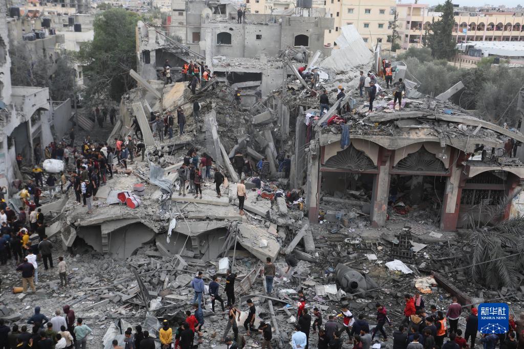 11月22日,人們在加沙地帶南部城市拉法的建筑廢墟上實(shí)施救援。