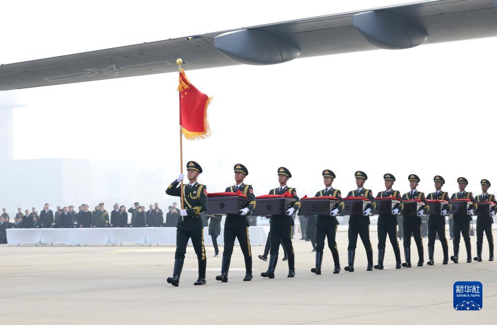 11月23日上午,中韓雙方在韓國仁川國際機場(chǎng)共同舉行在韓中國人民志愿軍烈士遺骸交接儀式。中韓雙方代表現場(chǎng)簽署交接書(shū),確認交接25位在韓中國人民志愿軍烈士遺骸及相關(guān)遺物。