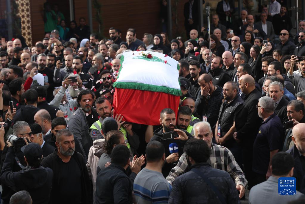 11月22日,在黎巴嫩貝魯特,人們?yōu)閮擅谝攒娨u擊中喪生的記者舉行葬禮。