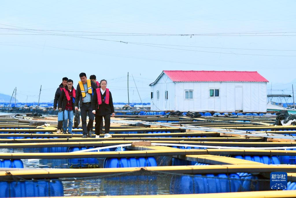 11月14日,福建省寧德市霞浦縣溪南鎮七星海上社區黨支部書(shū)記吳德枝(中)帶領(lǐng)工作人員在轄區漁排走訪(fǎng)。