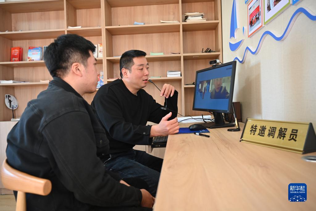 11月18日,在福建省寧德市霞浦縣溪南鎮七星海上社區訴非聯(lián)動(dòng)中心,霞浦縣法院特邀調解員(右)為漁民飼料款拖欠糾紛進(jìn)行視頻連線(xiàn)調解。