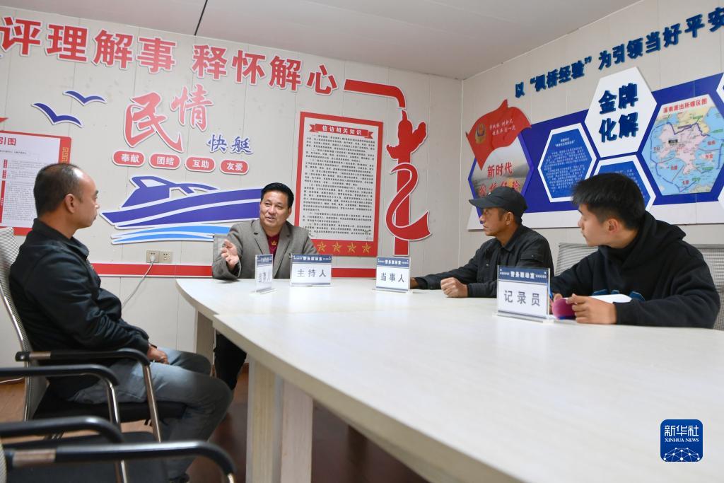 11月14日,福建省寧德市霞浦縣溪南鎮七星海上社區調解員謝友忠(左二)在調解一起海上養殖雇主與員工的工資糾紛。