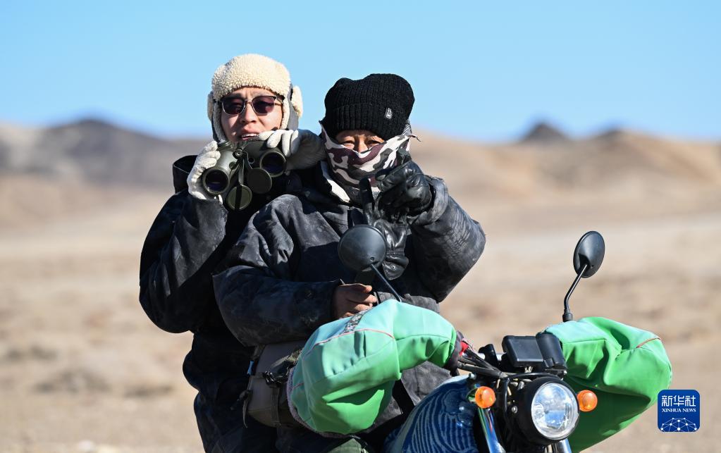 在內蒙古阿拉善左旗烏力吉蘇木溫都爾毛道嘎查,牧民朝勒門(mén)格爾勒(右)和兒子溫都蘇在邊境區域巡護(11月17日攝)。