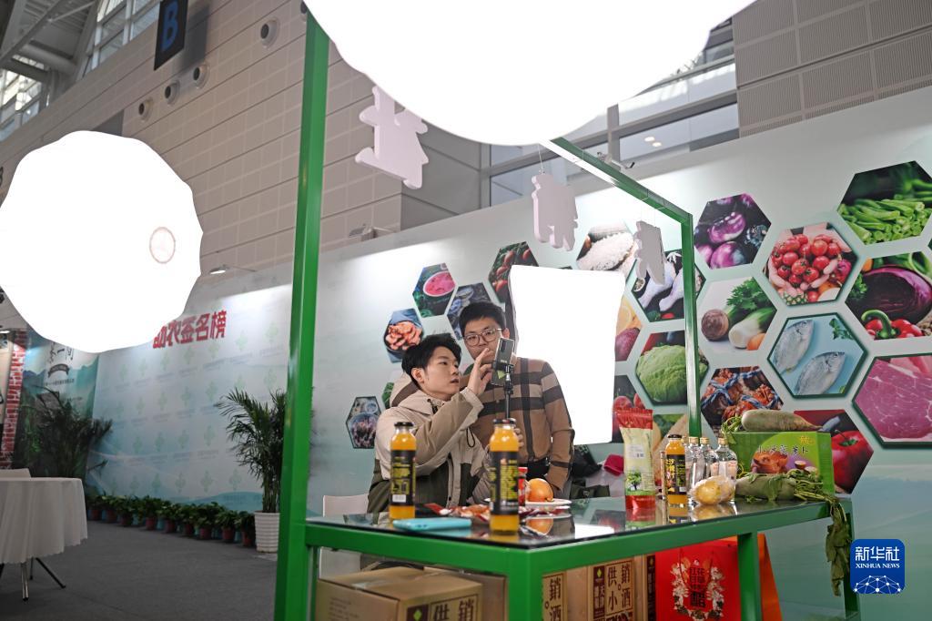 11月23日,參展商在國家會(huì )展中心(天津)優(yōu)質(zhì)農產(chǎn)品展區內進(jìn)行直播。