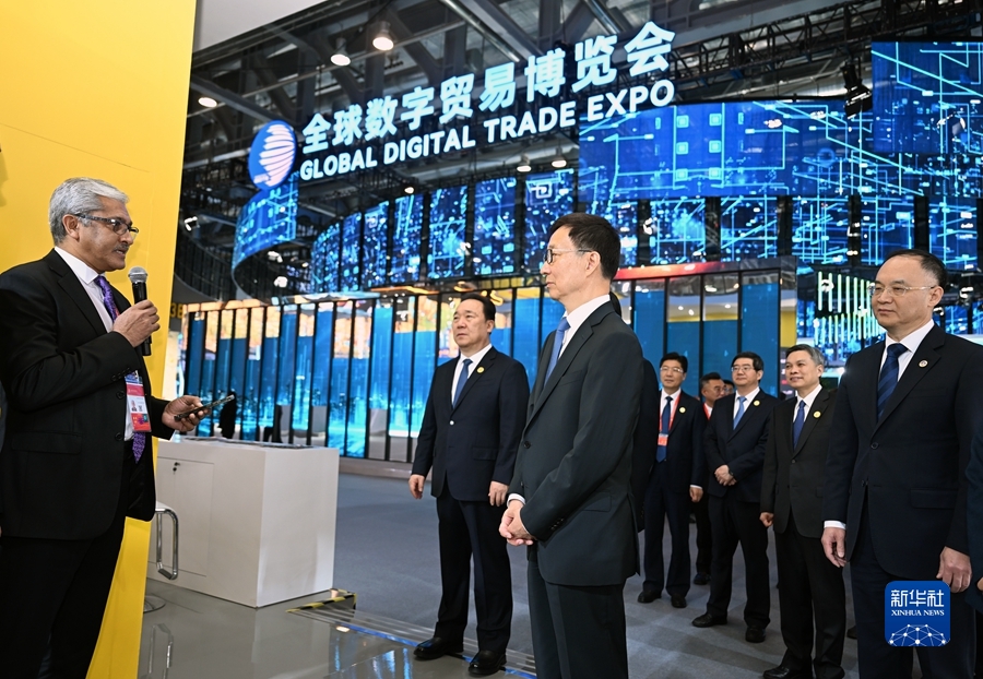 11月23日,國家副主席韓正在浙江杭州出席第二屆全球數字貿易博覽會(huì )開(kāi)幕式,宣讀習近平主席賀信并致辭。這是開(kāi)幕式前,韓正巡視博覽會(huì )展館。
