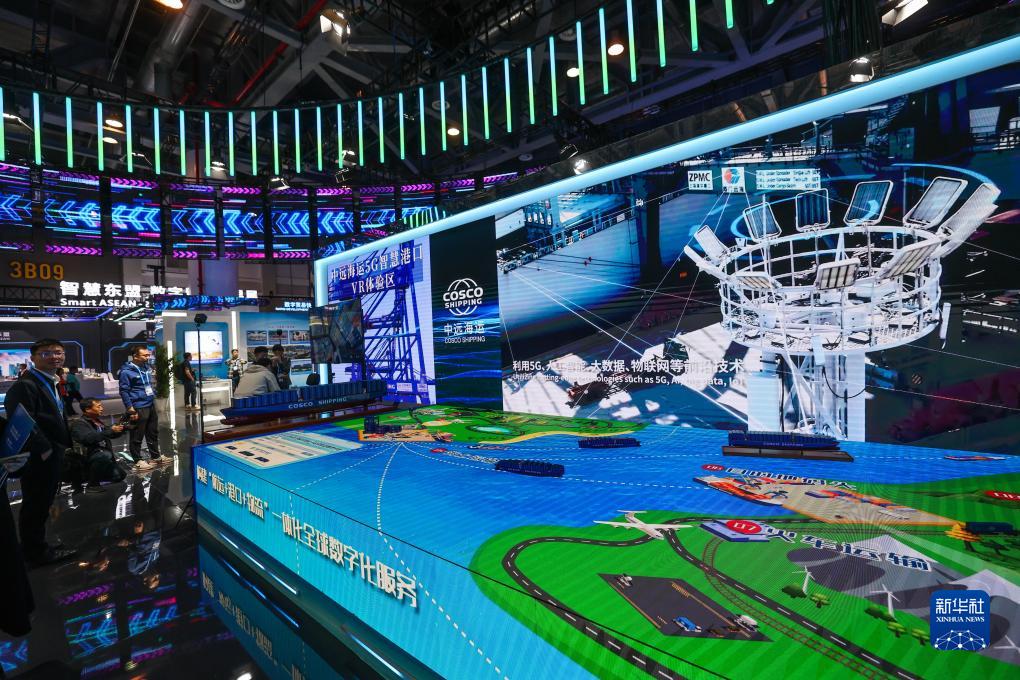 11月23日在第二屆全球數字貿易博覽會(huì )綜合館拍攝的“中遠海運5G智慧港口VR體驗區”。