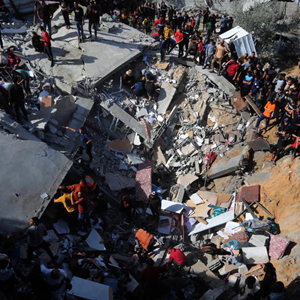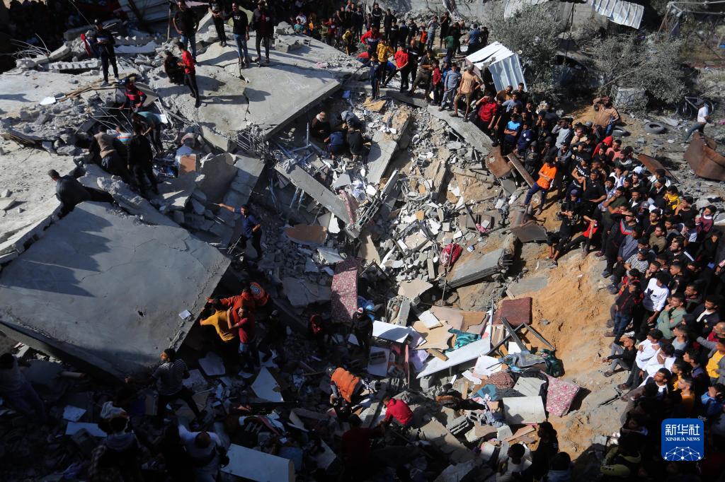 11月23日,人們聚集在加沙地帶南部城市拉法一處廢墟上。