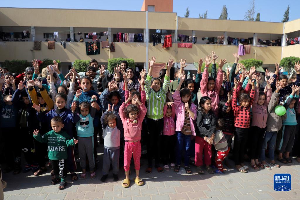 這是11月23日在加沙地帶南部城市汗尤尼斯拍攝的與當地志愿者互動(dòng)的兒童。