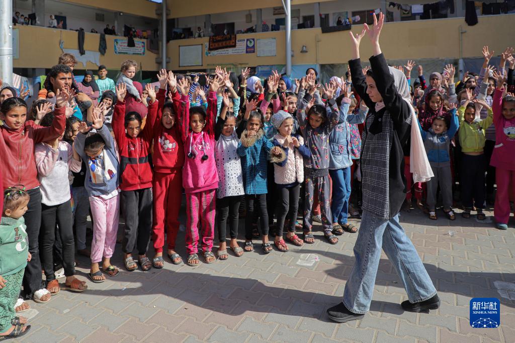 11月23日,在加沙地帶南部城市汗尤尼斯,當地志愿者和兒童進(jìn)行互動(dòng)。