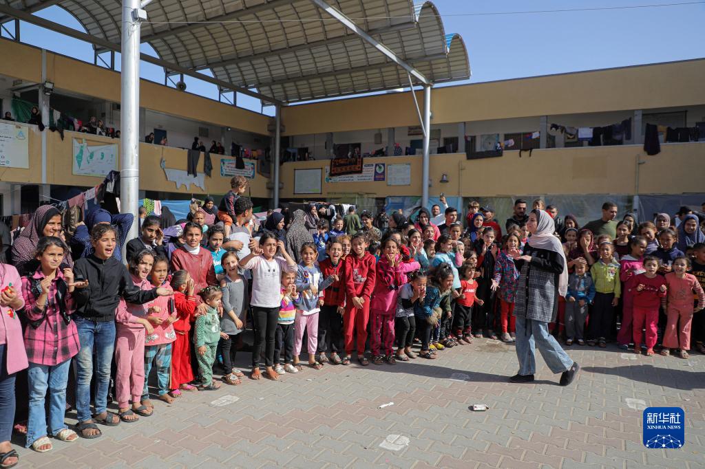 11月23日,在加沙地帶南部城市汗尤尼斯,當地志愿者和兒童進(jìn)行互動(dòng)。