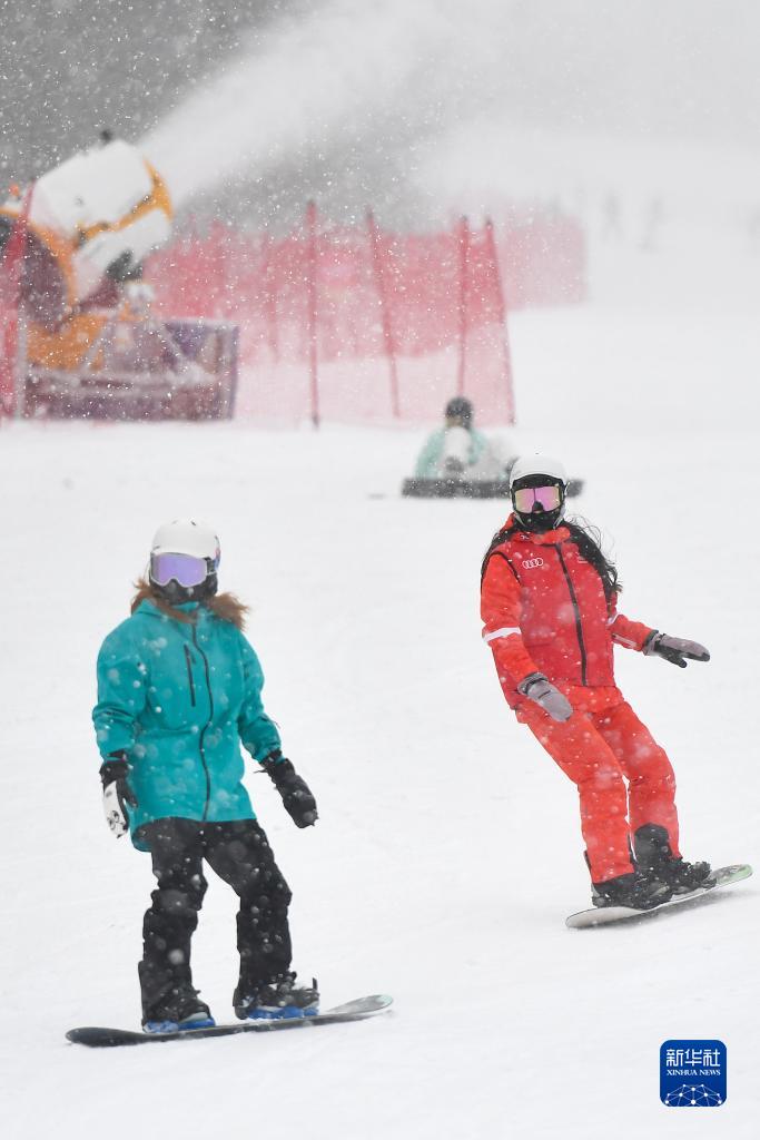 11月23日,在北大湖滑雪度假區,王雪(右)在教學(xué)員滑雪。