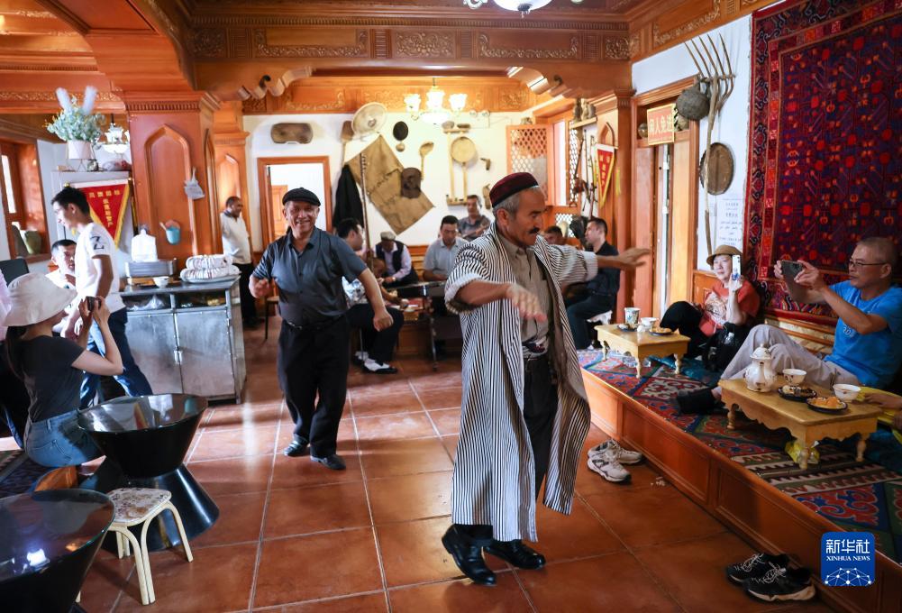 新疆喀什古城百年老茶館內,演員為游客表演舞蹈(9月7日攝)。