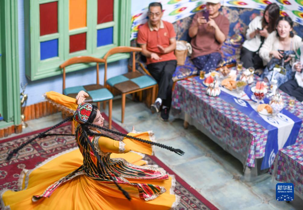 新疆喀什古城景區“古麗的家”旅游家訪(fǎng)點(diǎn),演員隨音樂(lè )起舞(9月7日攝)。