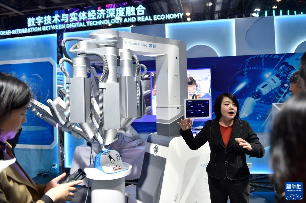 這是11月23日在第二屆全球數字貿易博覽會(huì )上拍攝的腔鏡手術(shù)機器人。