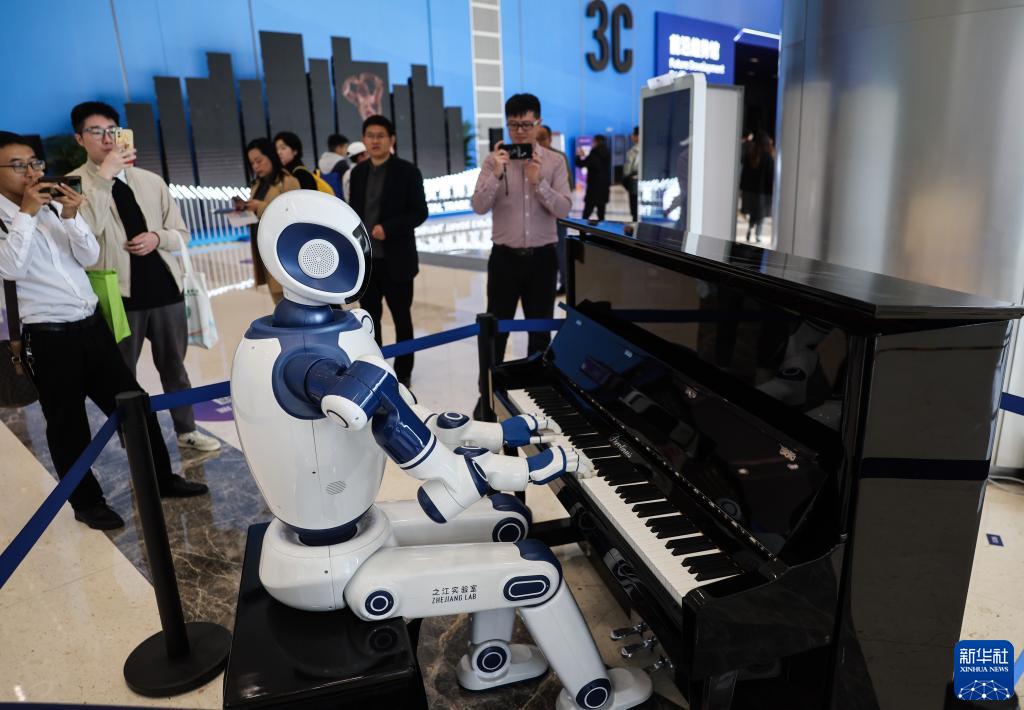 這是11月24日在第二屆全球數字貿易博覽會(huì )上拍攝的會(huì )彈鋼琴的機器人。