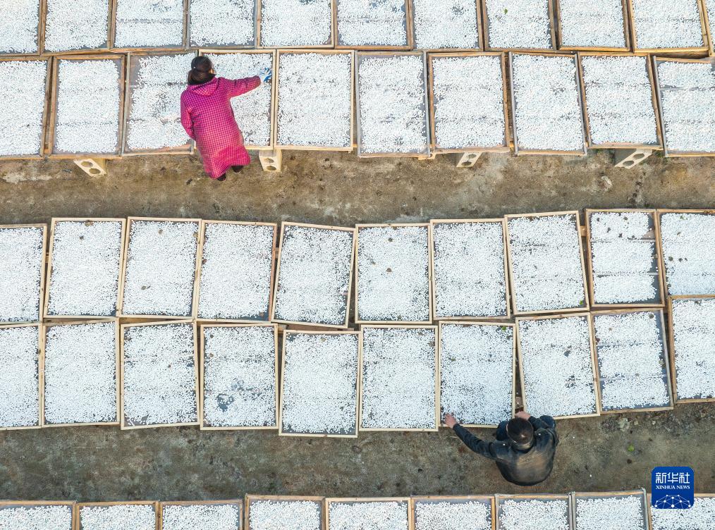 11月23日,在湖北省羅田縣九資河鎮天堂湖村,藥農在晾曬茯苓(無(wú)人機照片)。