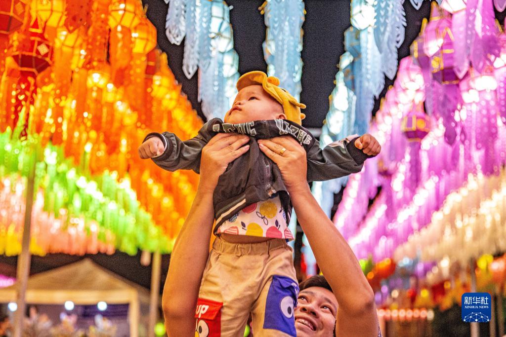 11月23日,在泰國南奔府哈利奔猜寺,一名男子舉著(zhù)孩子觀(guān)賞燈籠。