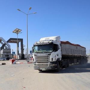 11月24日,運送救援物資的卡車(chē)進(jìn)入拉法口岸加沙一側。