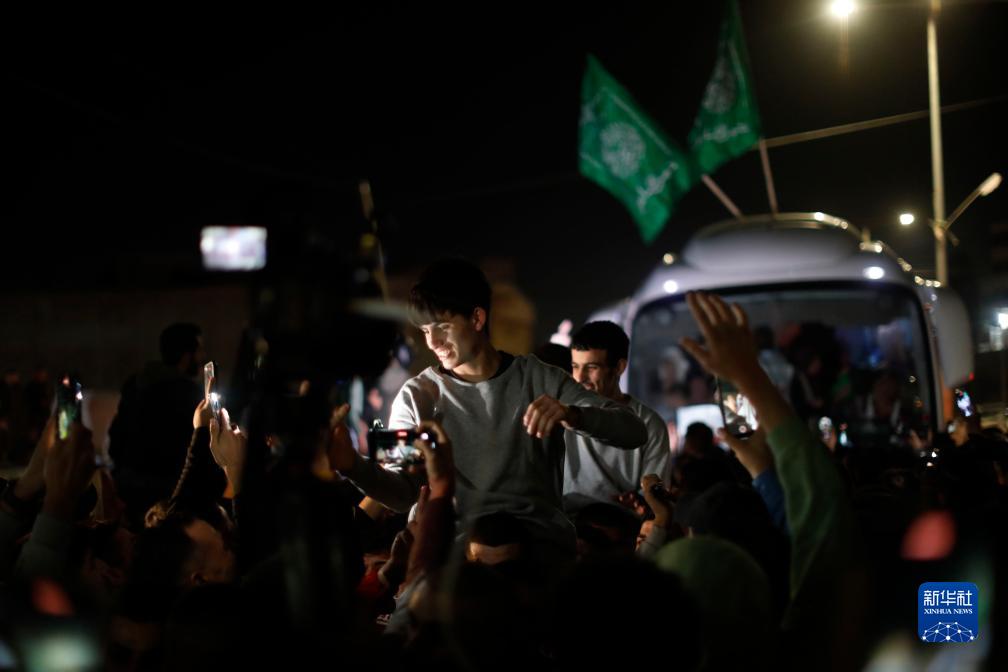 11月24日,在約旦河西岸城市拉姆安拉附近的拜圖尼亞鎮,人們慶祝被關(guān)押的巴勒斯坦人獲釋。