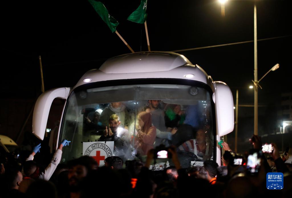 11月24日,在約旦河西岸城市拉姆安拉附近的拜圖尼亞鎮,獲釋的巴勒斯坦人乘車(chē)離開(kāi)。