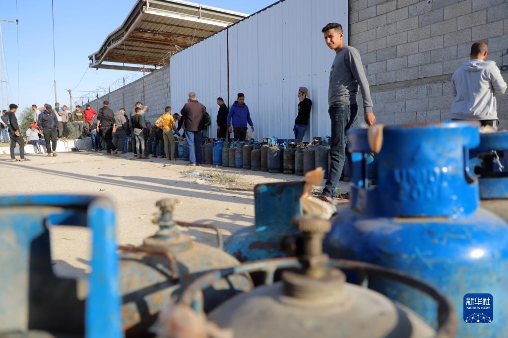 11月24日,在加沙地帶南部城市拉法,人們排隊等待充天然氣。