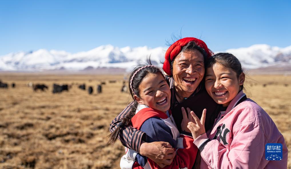 西藏當雄縣中學(xué)學(xué)生斯曲卓瑪(右)和爸爸、妹妹一起(11月15日攝)。