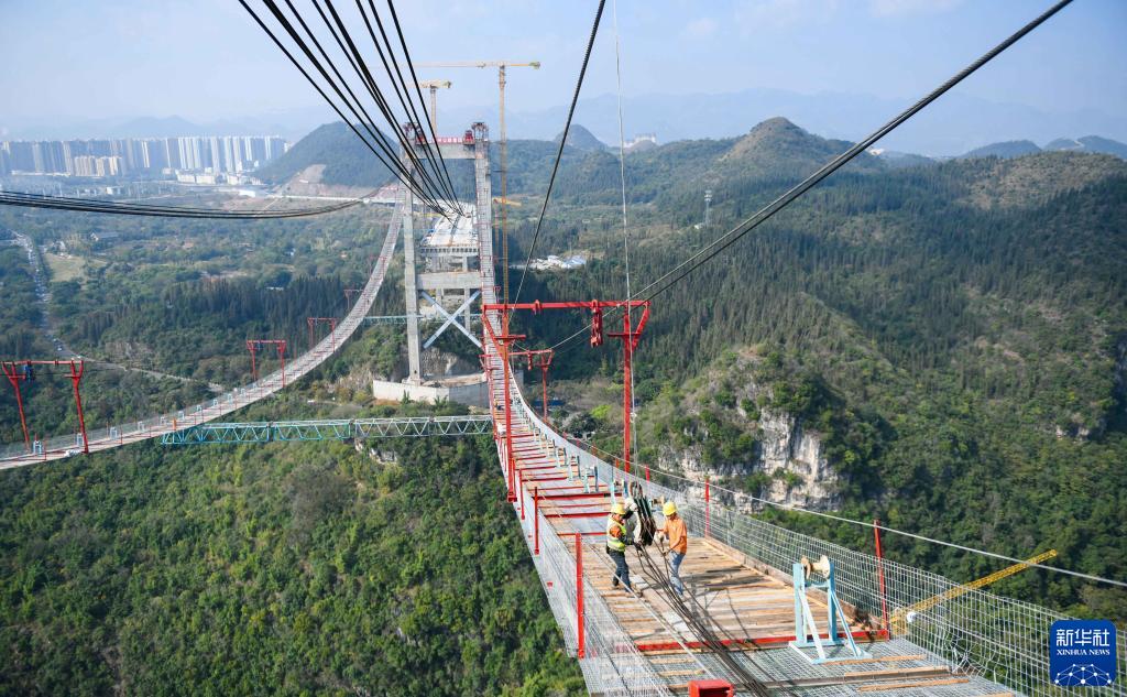 當日,由貴州公路集團承建的貴州省黔西南布依族苗族自治州興義市金州大橋首根主纜索股順利牽引,標志著(zhù)大橋正式進(jìn)入主纜架設階段。金州大橋是貴州省跨徑最大的市政懸索橋,是連接興義市和義龍新區的重要城市通道,大橋全長(cháng)1600米,設計時(shí)速60公里。