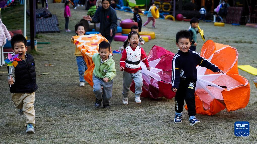 11月24日,在上海市實(shí)驗幼兒園,小朋友玩賽跑游戲。