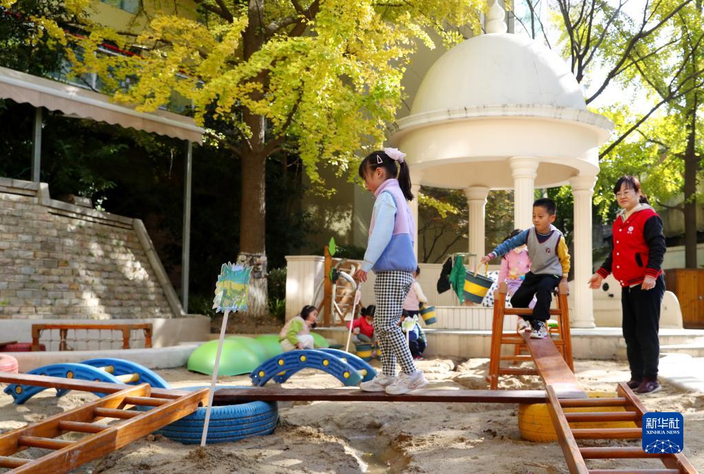 11月24日,在上海市實(shí)驗幼兒園,小朋友在沙坑內搭建的獨木橋上行走。