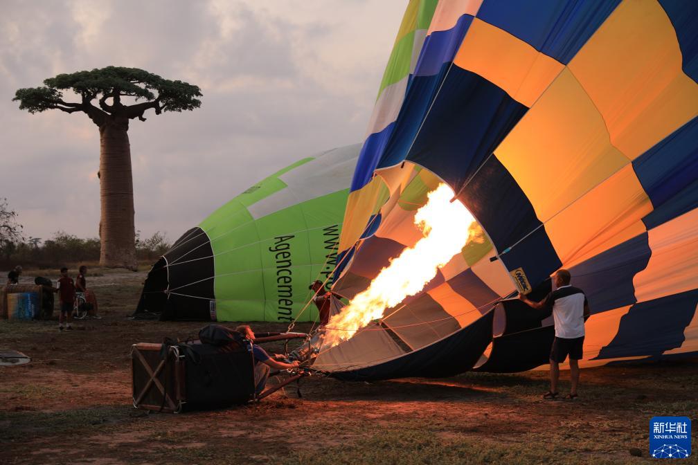 11月25日,在馬達加斯加穆龍達瓦猴面包樹(shù)大道,熱氣球旅行愛(ài)好者準備升空熱氣球。