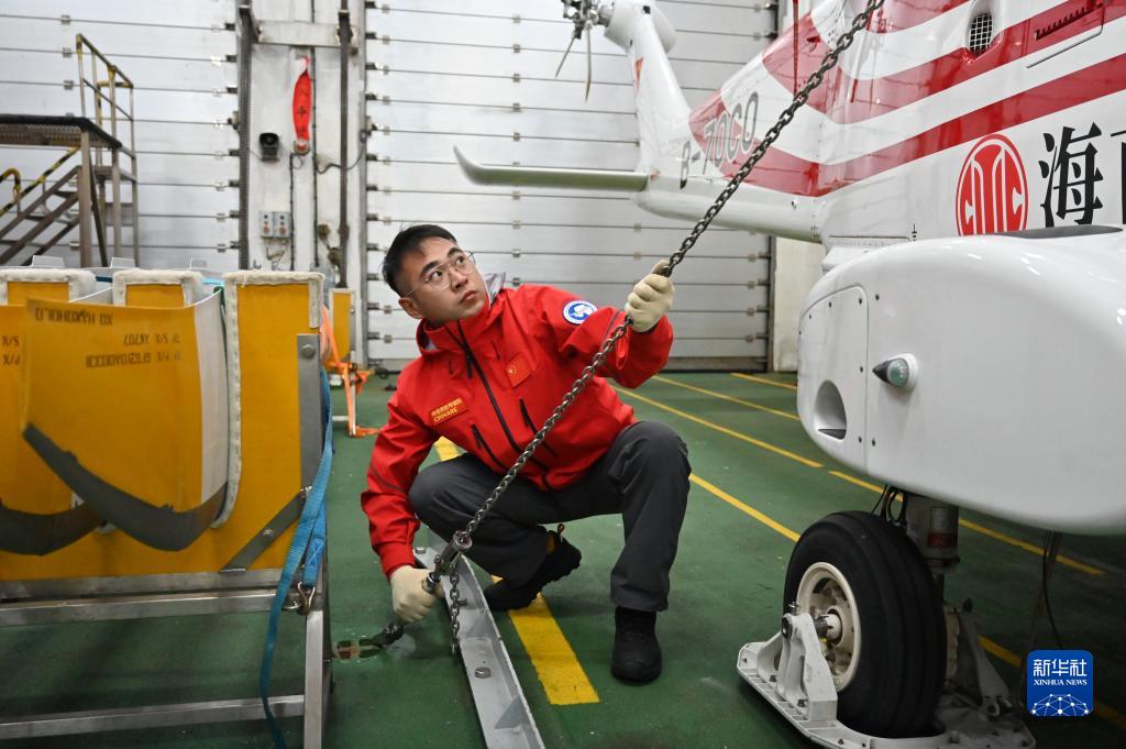 11月26日,“雪龍2”號機械員王法檢查加固直升機系留。