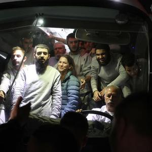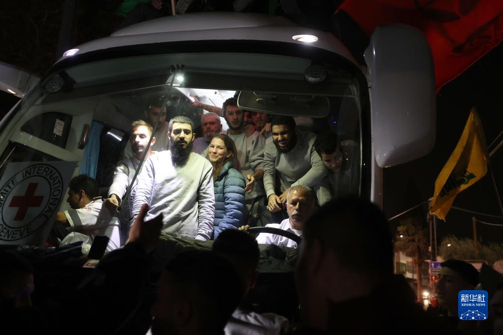 11月26日,載有獲釋巴勒斯坦被關(guān)押人員的大巴抵達約旦河西岸城市比拉。