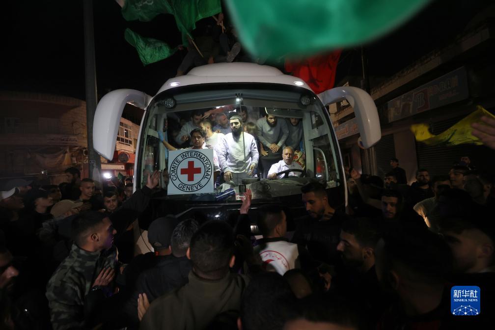 11月26日,載有獲釋巴勒斯坦被關(guān)押人員的大巴抵達約旦河西岸城市比拉。