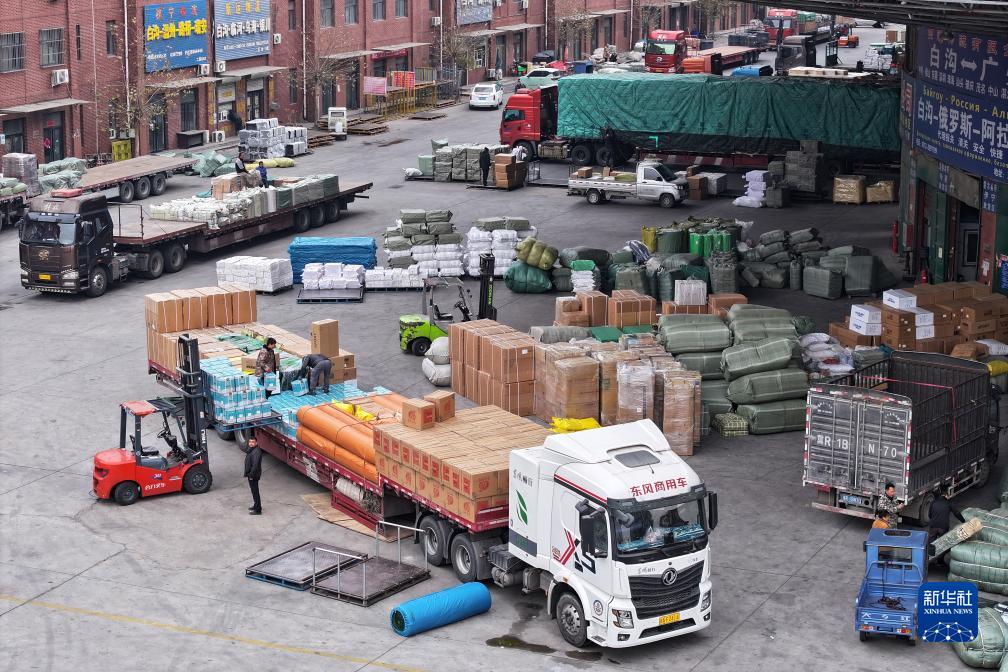 11月26日,在白溝新城東物流園區,貨車(chē)在裝卸貨物(無(wú)人機照片)。