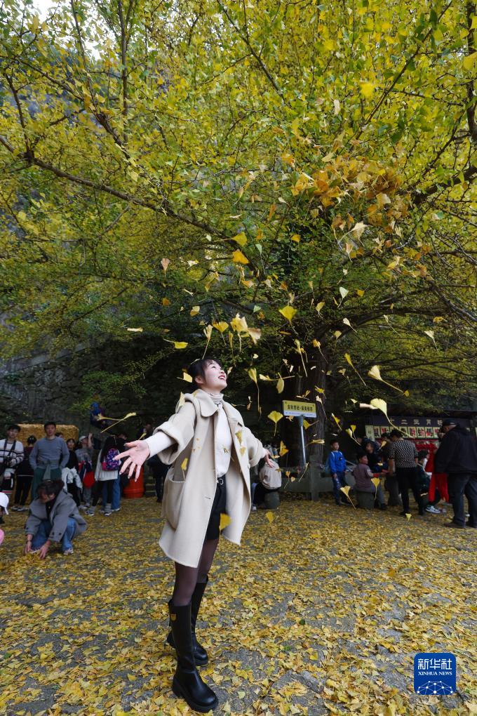 11月26日,游客在古銀杏樹(shù)下感受冬日美景。
