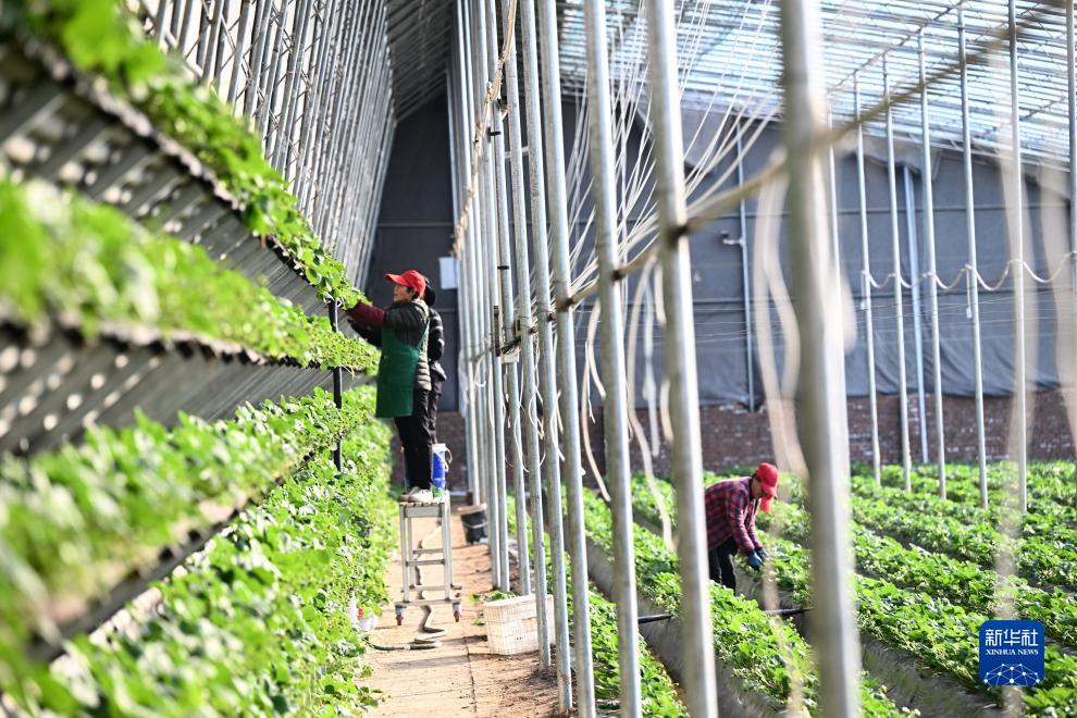 11月27日,農民在白溝新城一處智慧農業(yè)園為草莓疏果。