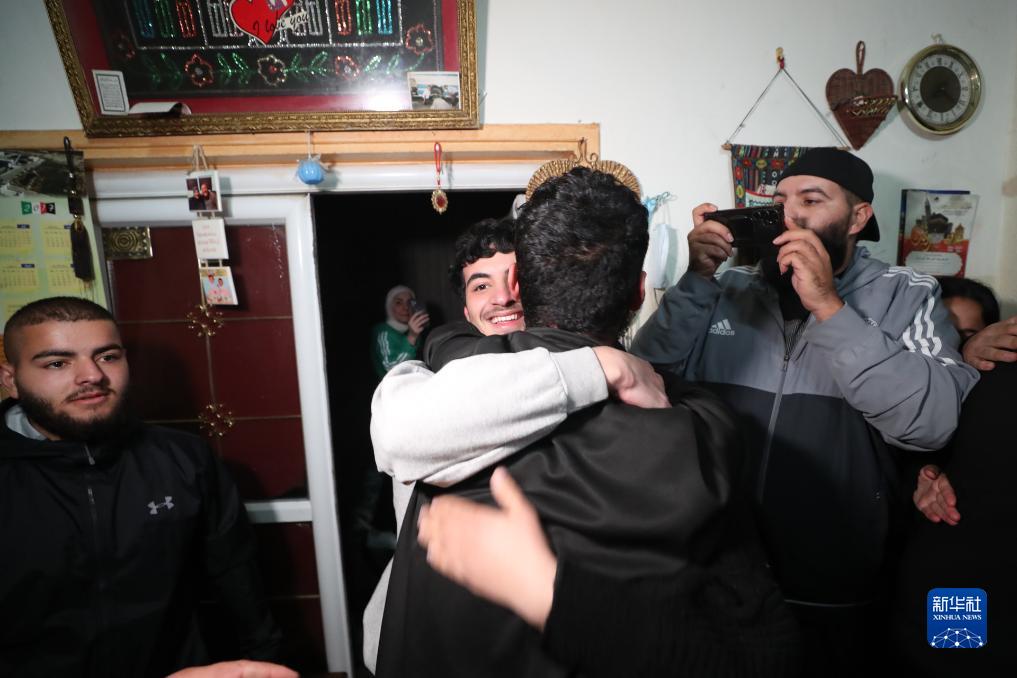 11月26日,一名被關(guān)押的巴勒斯坦人(灰衣者)獲釋后回到耶路撒冷。