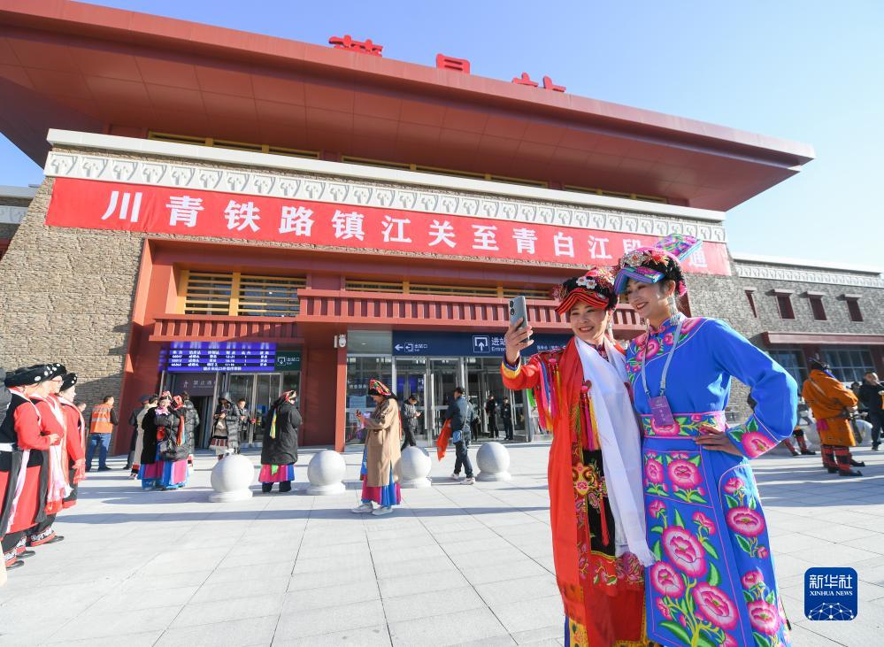 11月28日,在川青鐵路茂縣站,當地各族群眾在站前廣場(chǎng)慶祝鐵路開(kāi)通運營(yíng)。