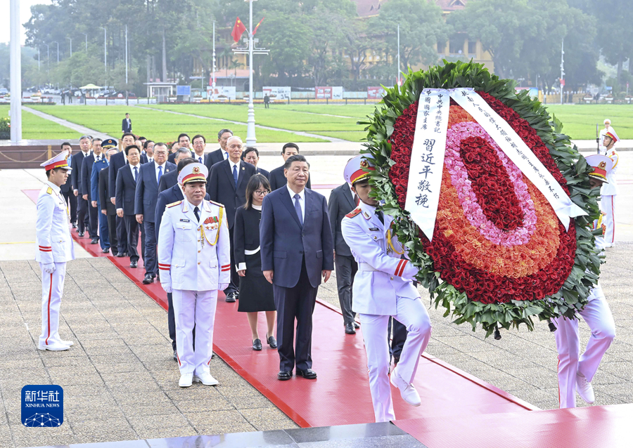 當地時(shí)間12月13日上午,中共中央總書(shū)記、國家主席習近平在河內瞻仰胡志明陵并敬獻花圈。新華社記者 申宏 攝