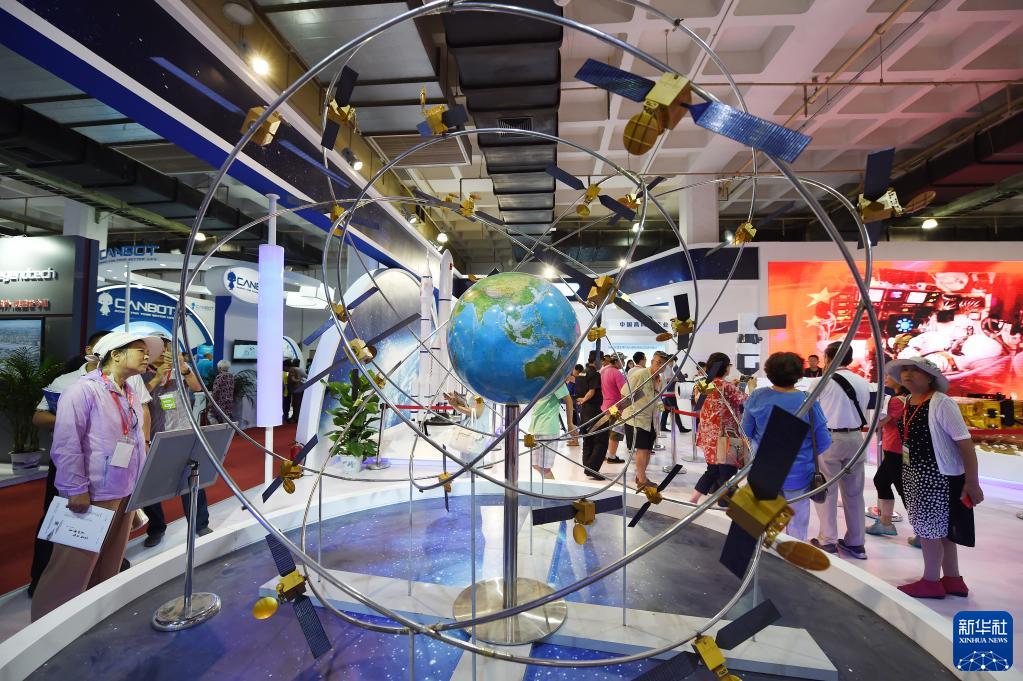 參觀(guān)者在第二十屆中國北京國際科技產(chǎn)業(yè)博覽會(huì )上參觀(guān)展出的北斗衛星導航系統模型(2017年6月9日攝)。新華社記者 鞠煥宗 攝